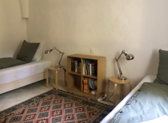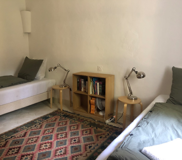 The first room is big and spacious, with a seating area, a small fridge and a queen size double bed. From here you walk down two steps to a separate bedroom with two single beds and the bathroom on the other hand.